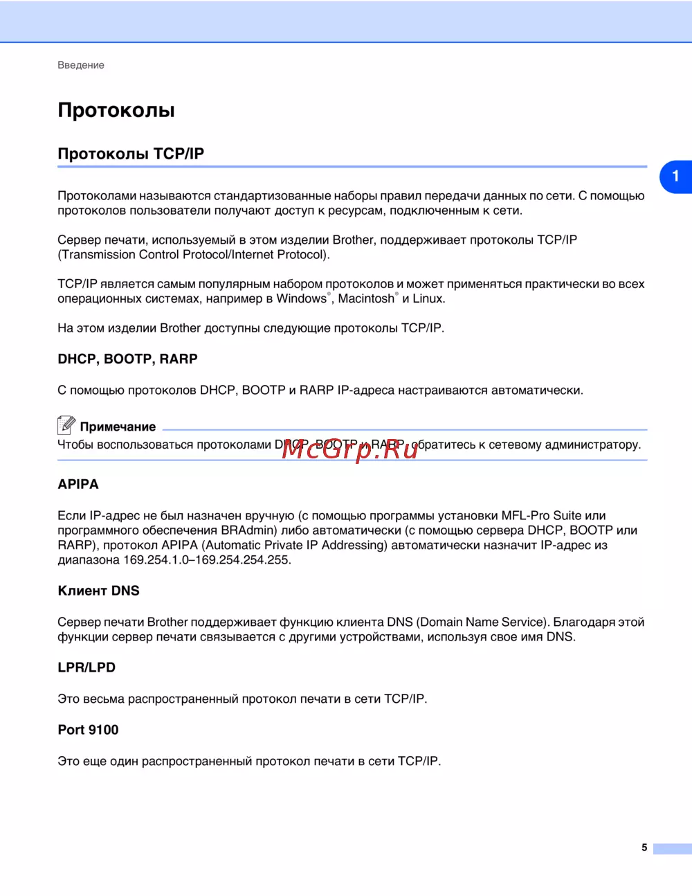Сервер печати, используемый в этом изделии Brother, поддерживает протоколы TCP/IP
