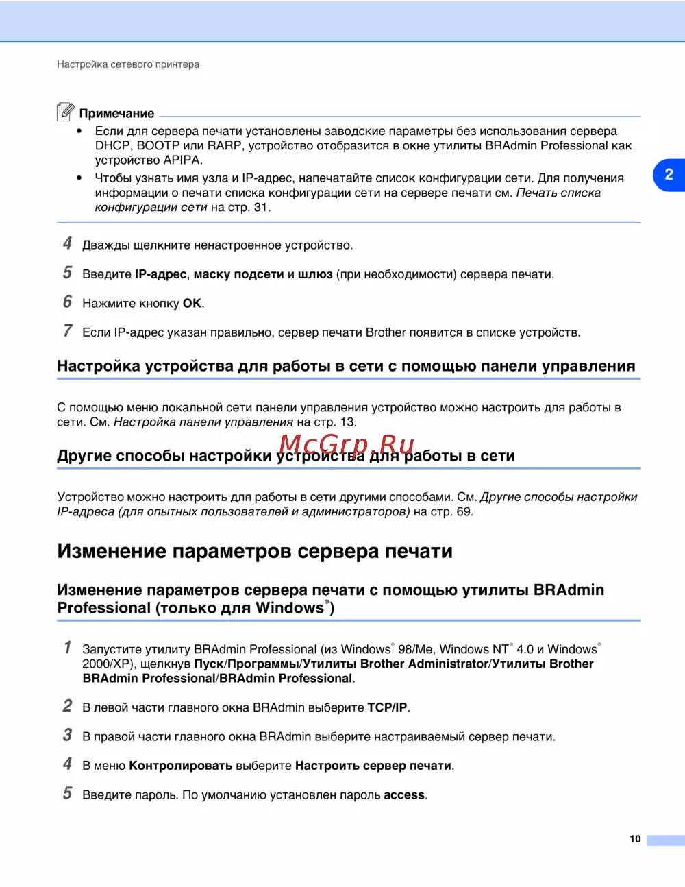 - Настройка ip адреса с помощью серверного программного обеспечения brother web bradmin для iis p.85