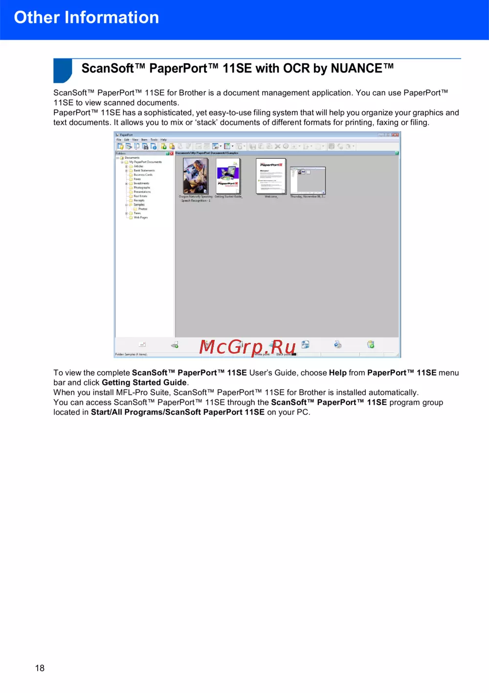 When you install MFL-Pro Suite, ScanSoft™ PaperPort™ 11SE for Brother is installed automatically.