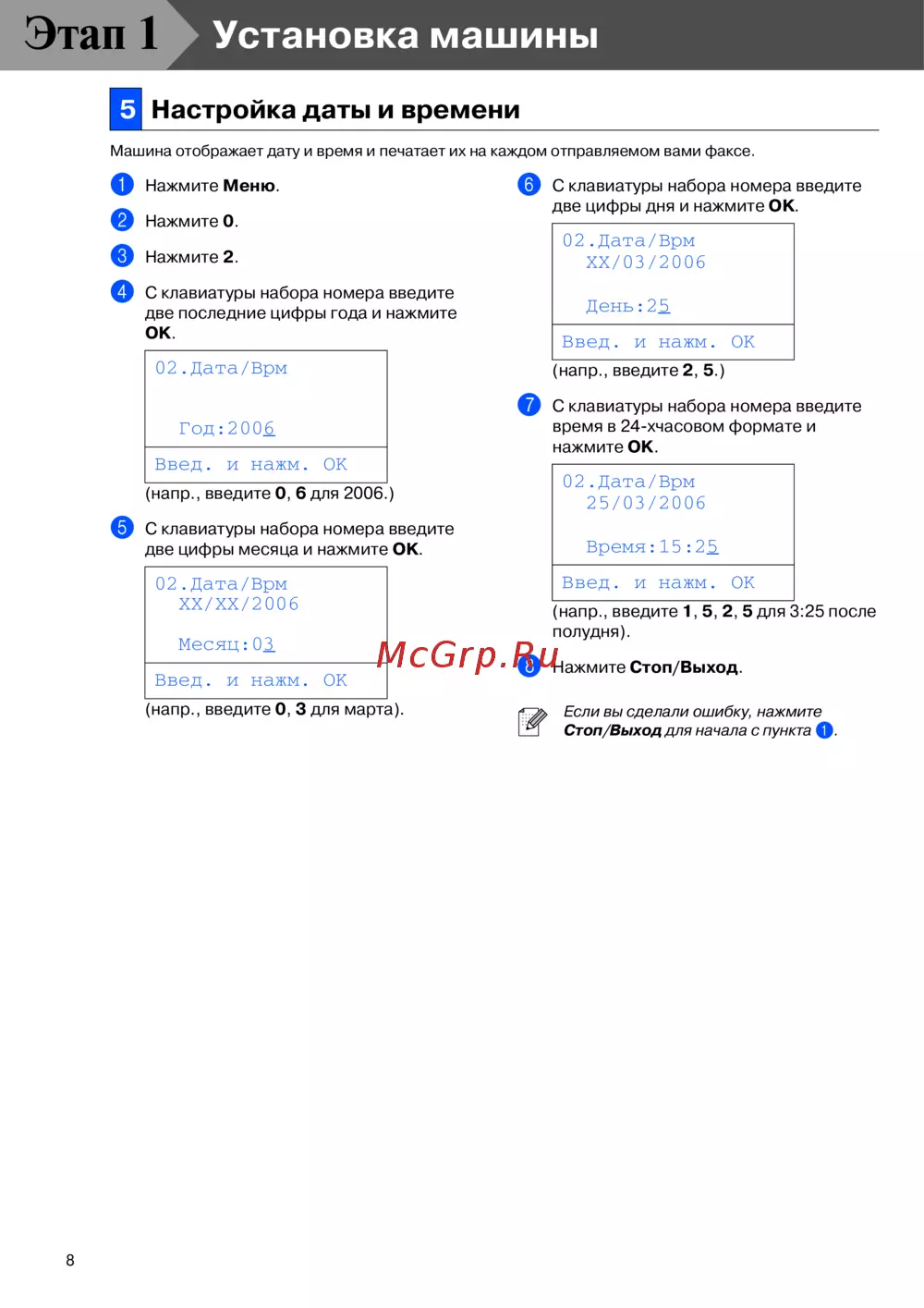 Brother MFC-8870DW — как настроить дату и время на факсимильном аппарате [10/41]