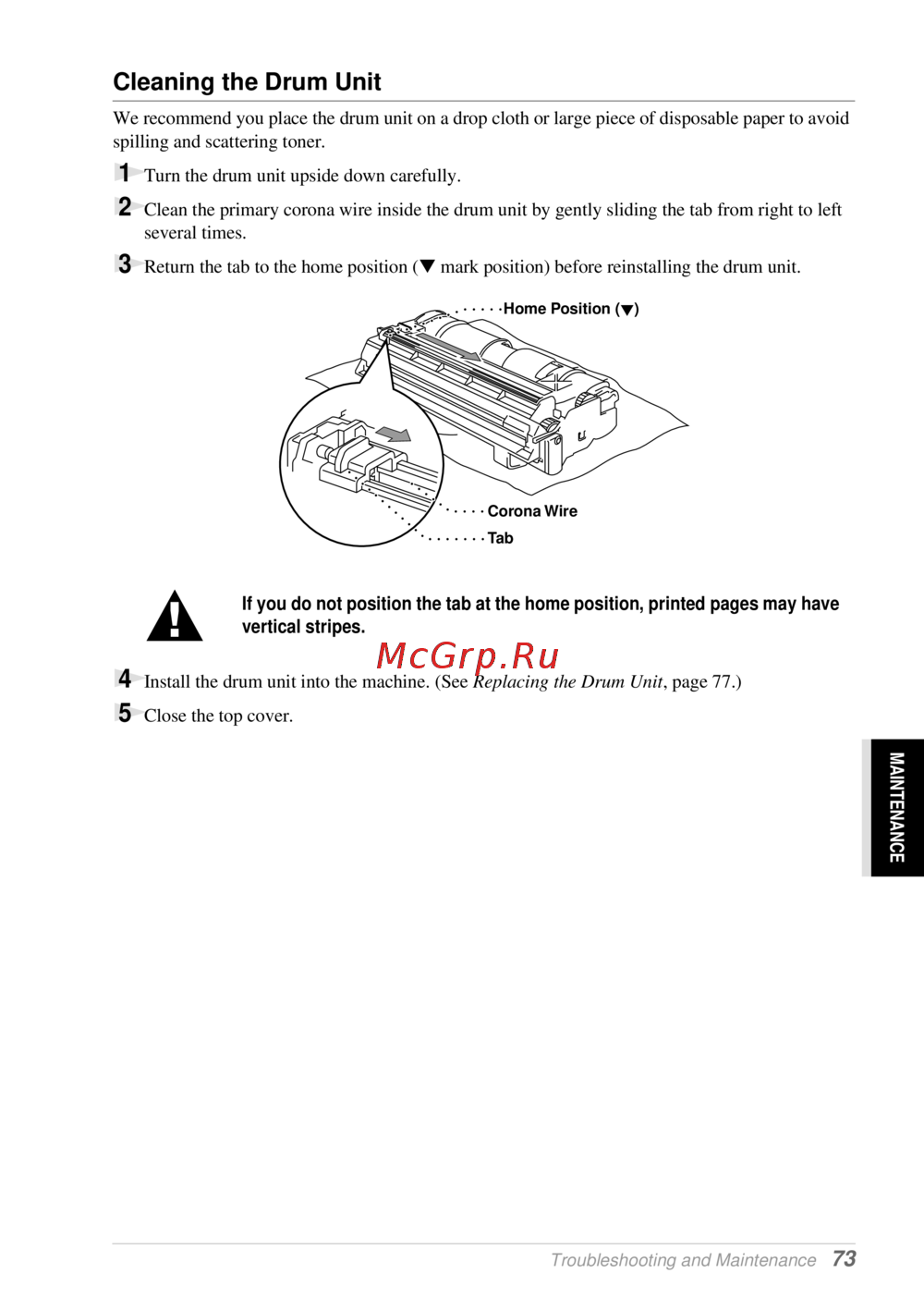 Return the tab to the home position (▼ mark position) before reinstalling the drum unit.