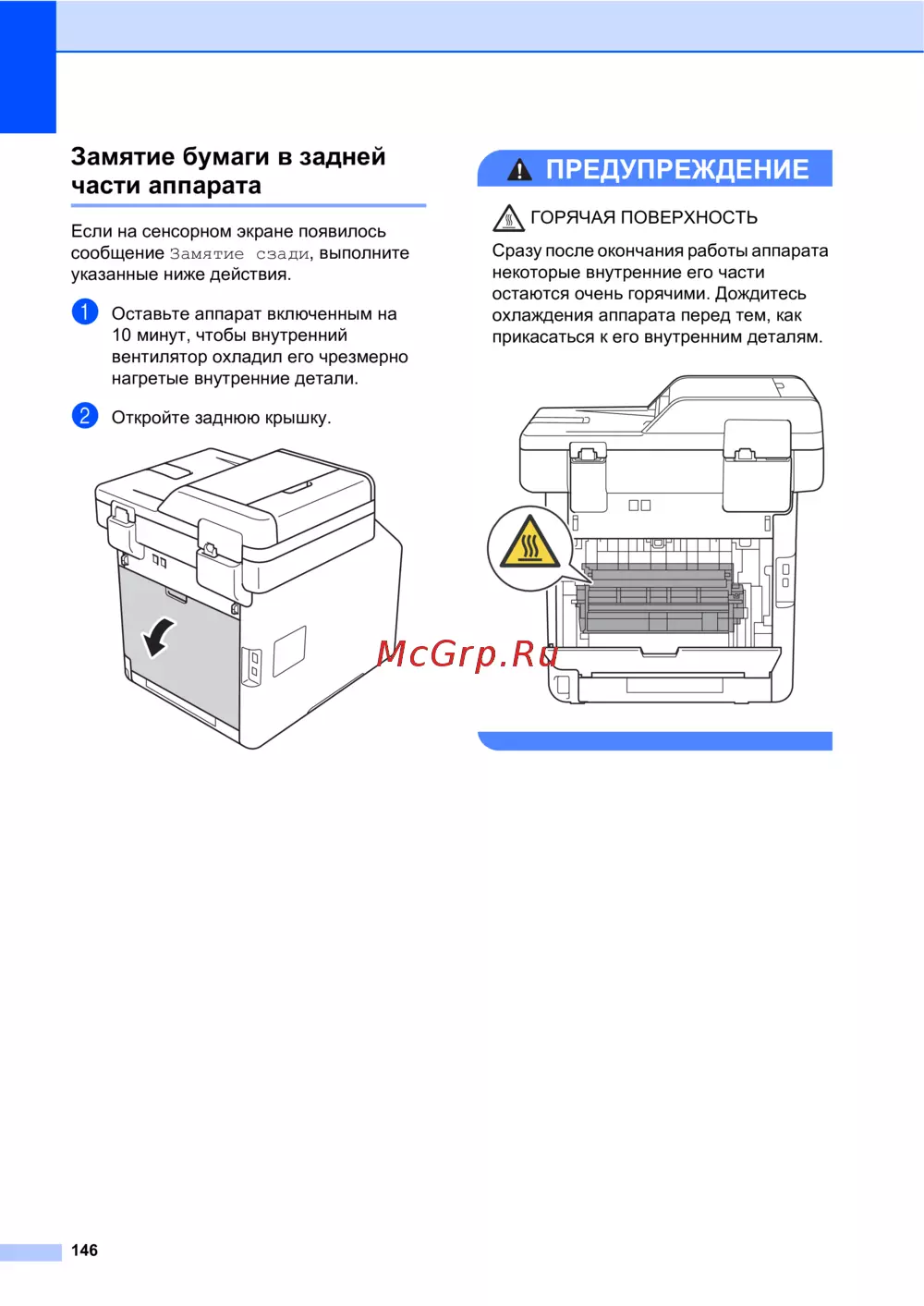 Узнайте, как правильно устранить замятие бумаги в задней части аппарата. Следуйте простым шагам для безопасного охлаждения и открытия устройства.