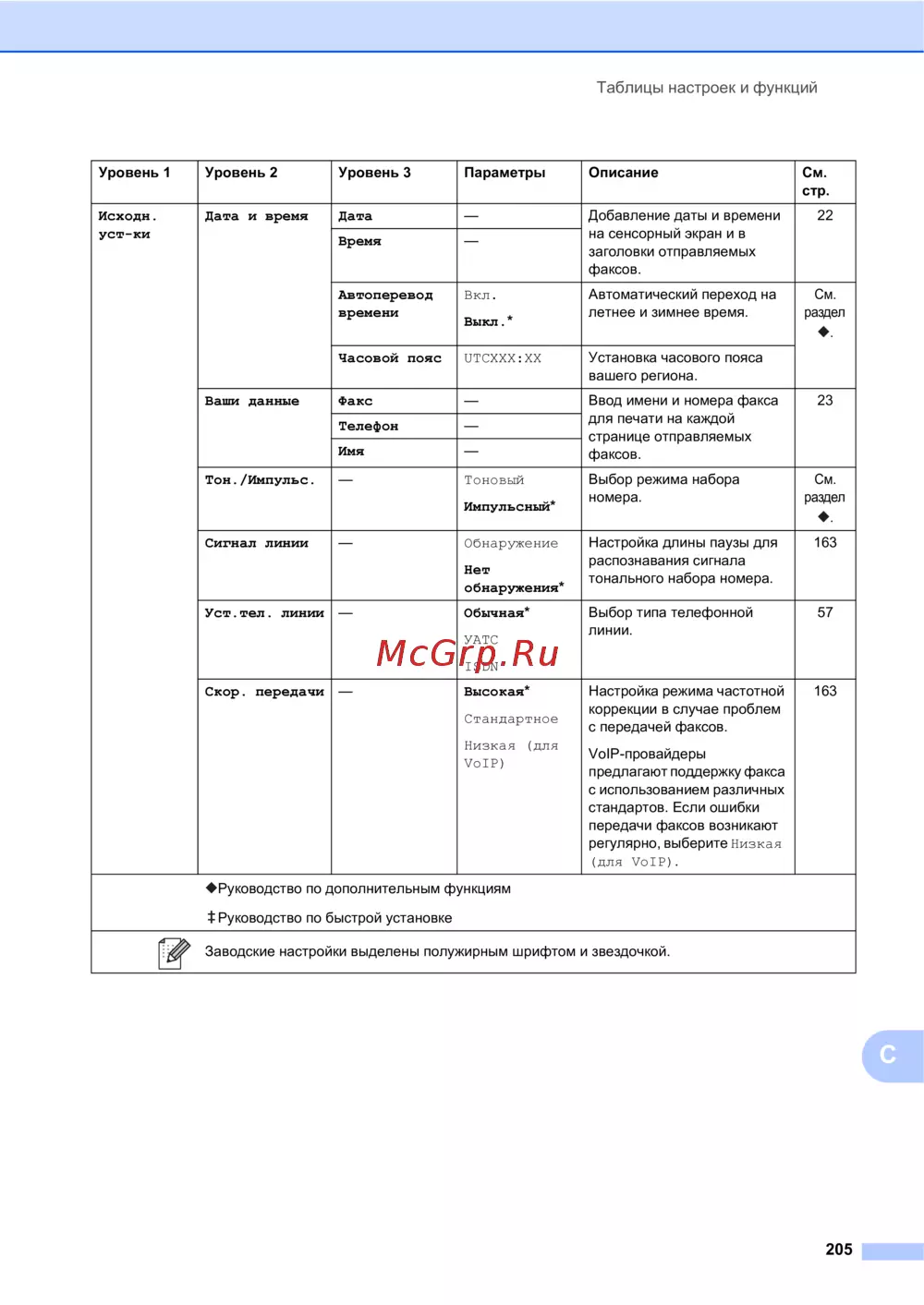 Заводские настройки выделены полужирным шрифтом и звездочкой.