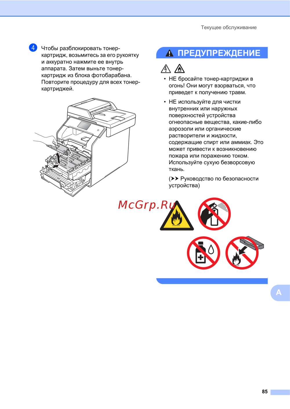 Brother MFC-L8850CDW — инструкции по обслуживанию и безопасности тонер-картриджей [95/269]