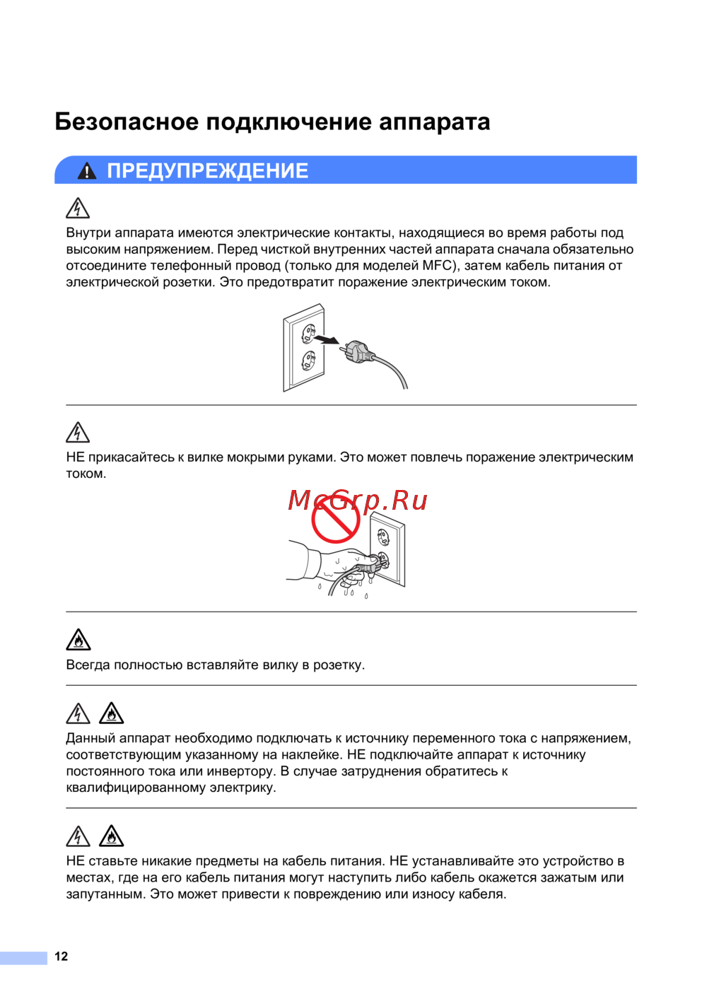 Brother MFC-L8850CDW — безопасное подключение электрических аппаратов: советы и предупреждения [12/24]