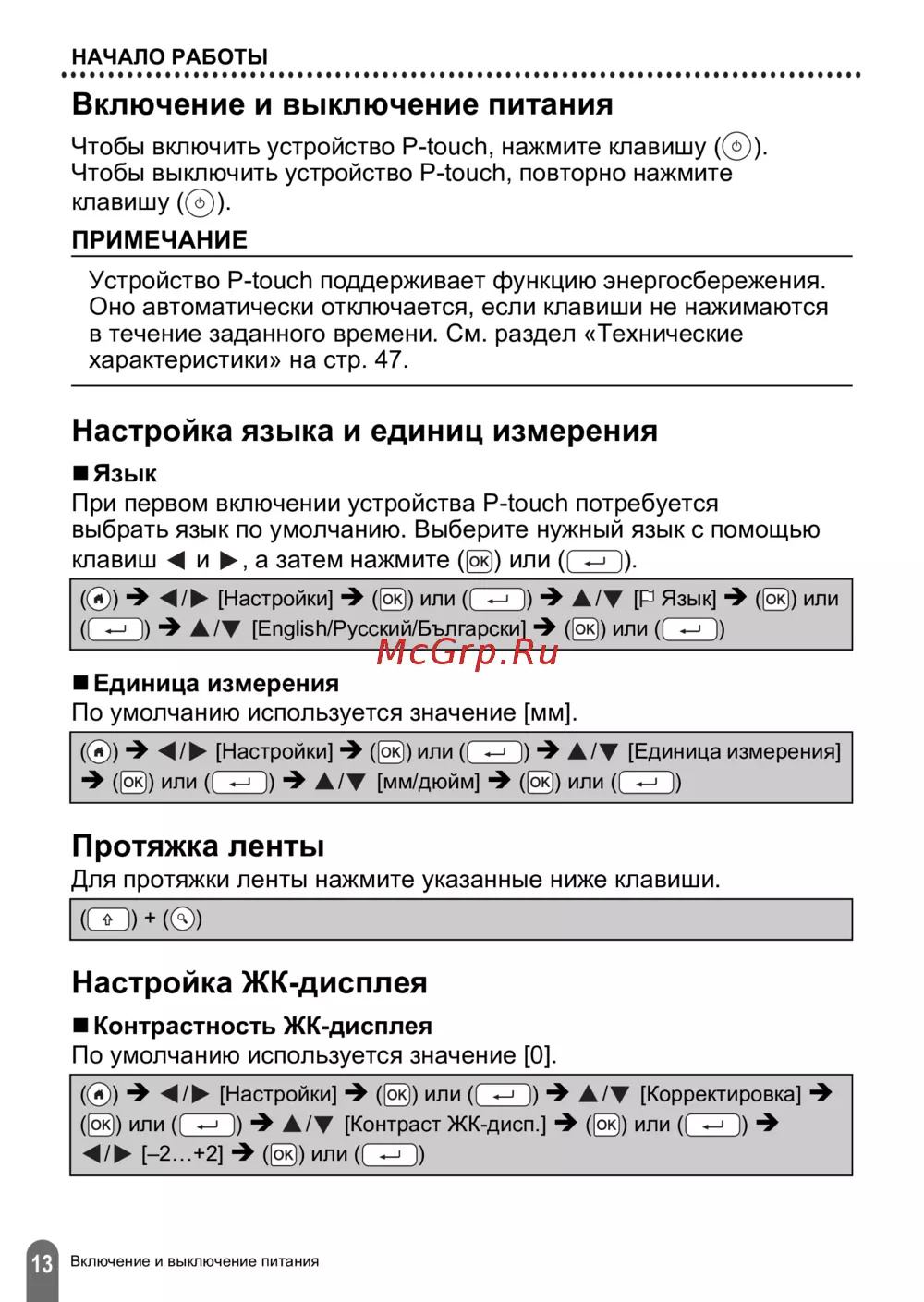 - Для протяжки ленты нажмите указанные ниже клавиши p.16