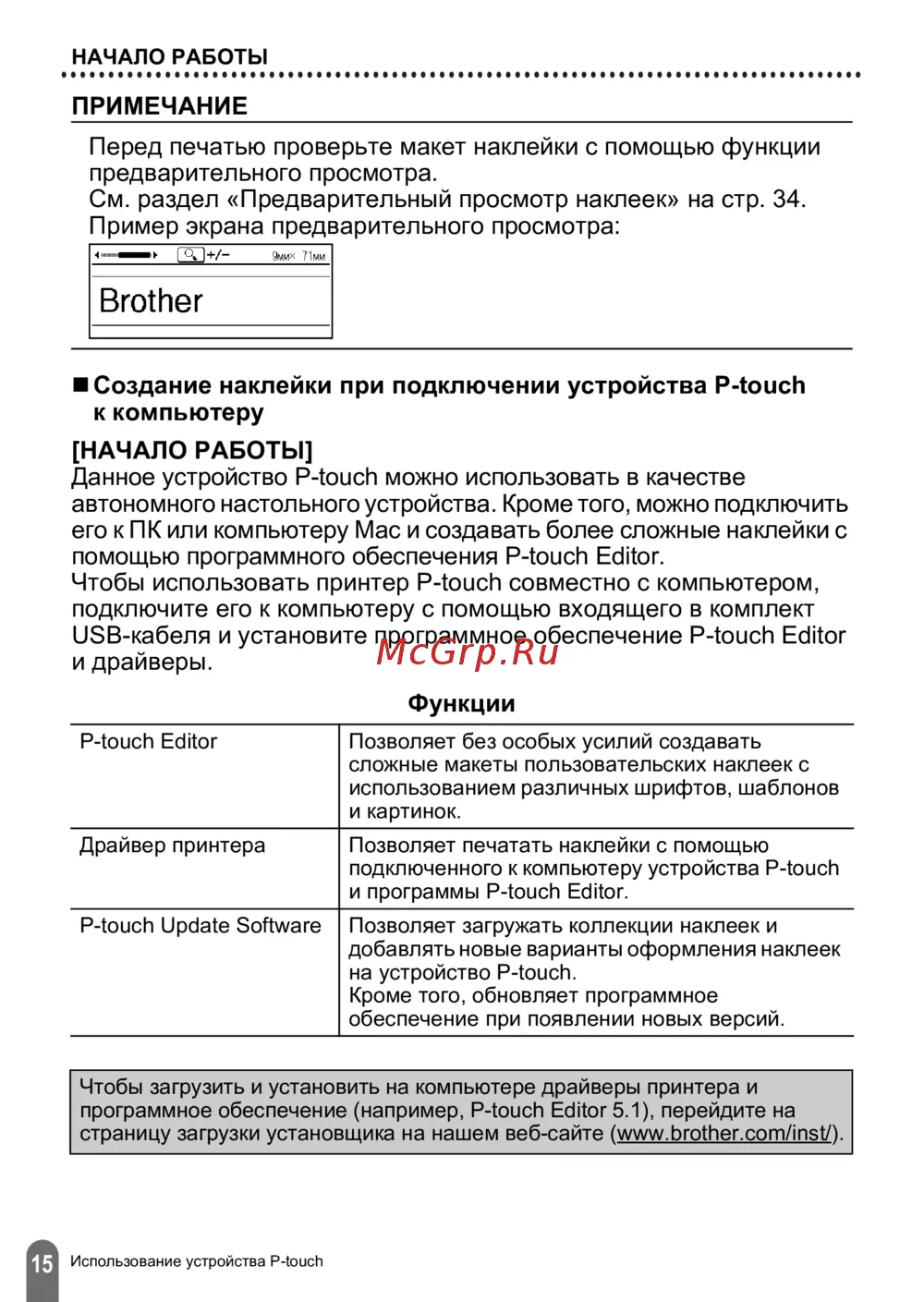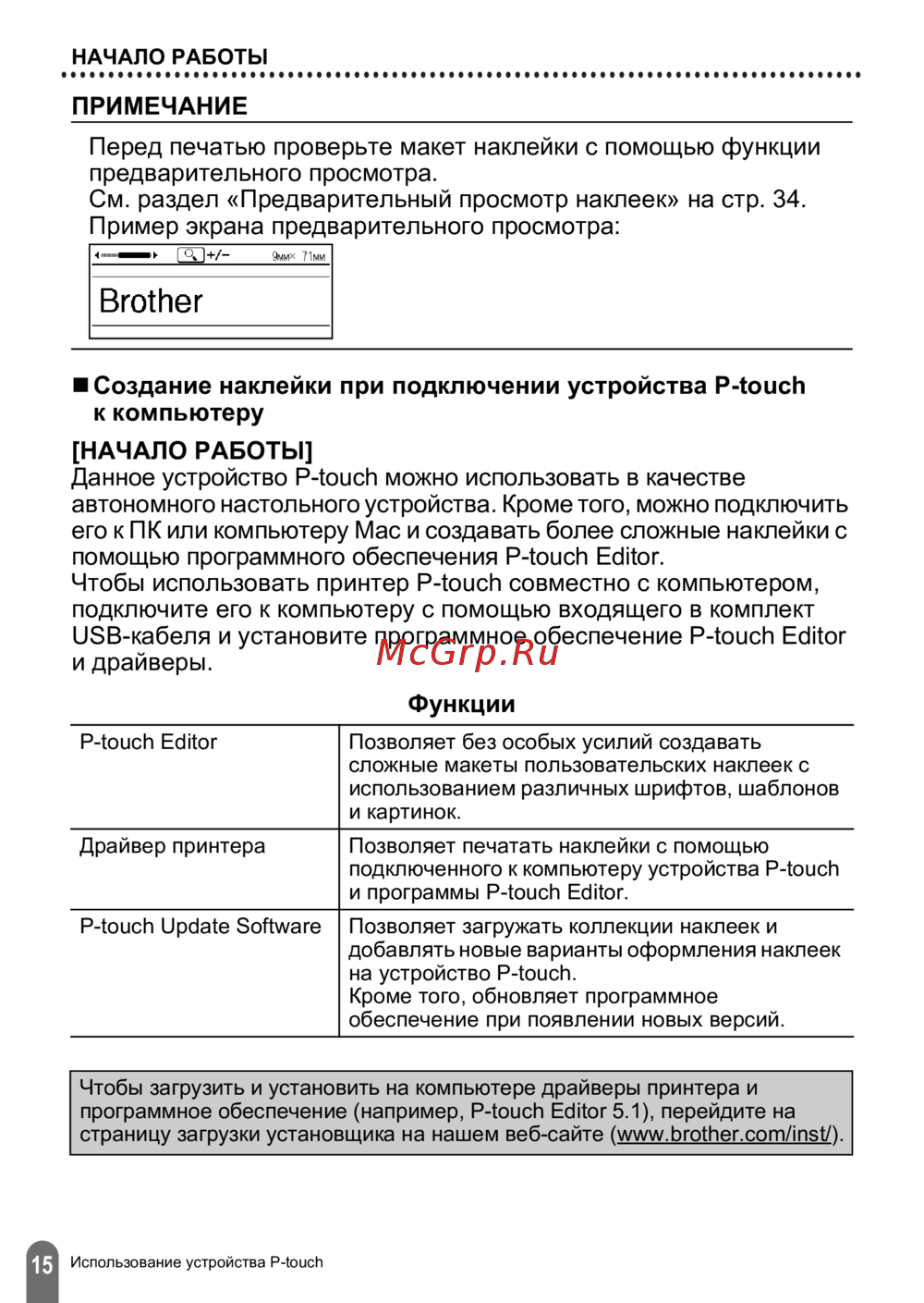 ![Brother PT-D450 [18/52] Начало работы данное устройство p touch можно использовать в качестве автономного настольного устройства кроме того можно подключить его к пк или компьютеру mac и создавать более сложные наклейки с помощью программного обеспечения p touch editor чтобы использовать принтер p touch совместно с компьютером подключите его к компьютеру с помощью входящего в комплект usb кабеля и установите программное обеспечение p touch editor и драйверы](/views2/1470150/page18/bg12.png)