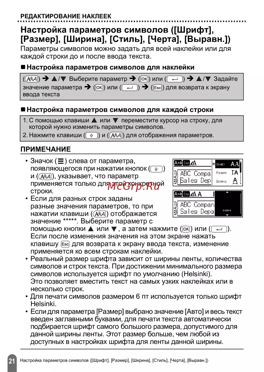 - Когда включен режим верхнего регистра все буквы будут вводиться в верхнем регистре можно ввести текст длиной до 280 символов используйте кнопку в сочетании с буквенными и цифровыми клавишами для ввода букв в верхнем регистре или символов указанных в правом верхнем углу клавиш используйте кнопку или в сочетании с клавишей для перехода к началу предыдущего или следующего блока используйте кнопку или в сочетании с клавишей для перехода к началу или концу текущей строки чтобы при выборе настроек восстановить их значения по умолчанию нажмите клавишу если не указано иное нажмите клавишу для отмены операции нажмите клавишу для возврата к начальному экрану фактическая длина напечатанной наклейки может немного отличаться от отображаемой на дисплее p.13