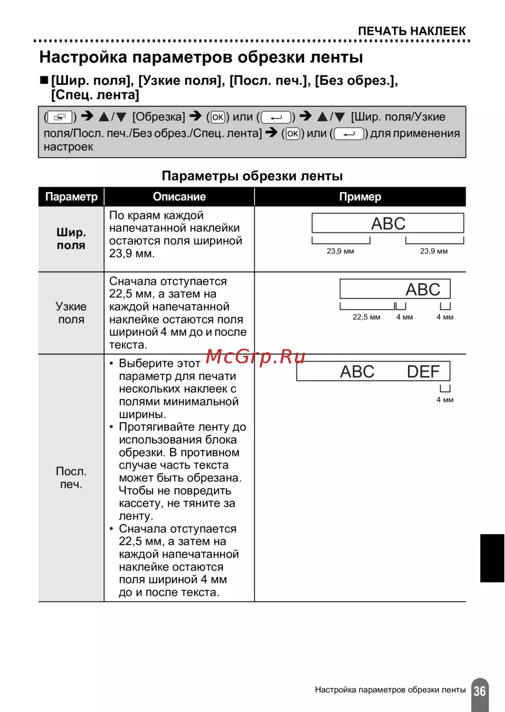 - Настройка параметров наклейки длина обрезка размер табул p.28