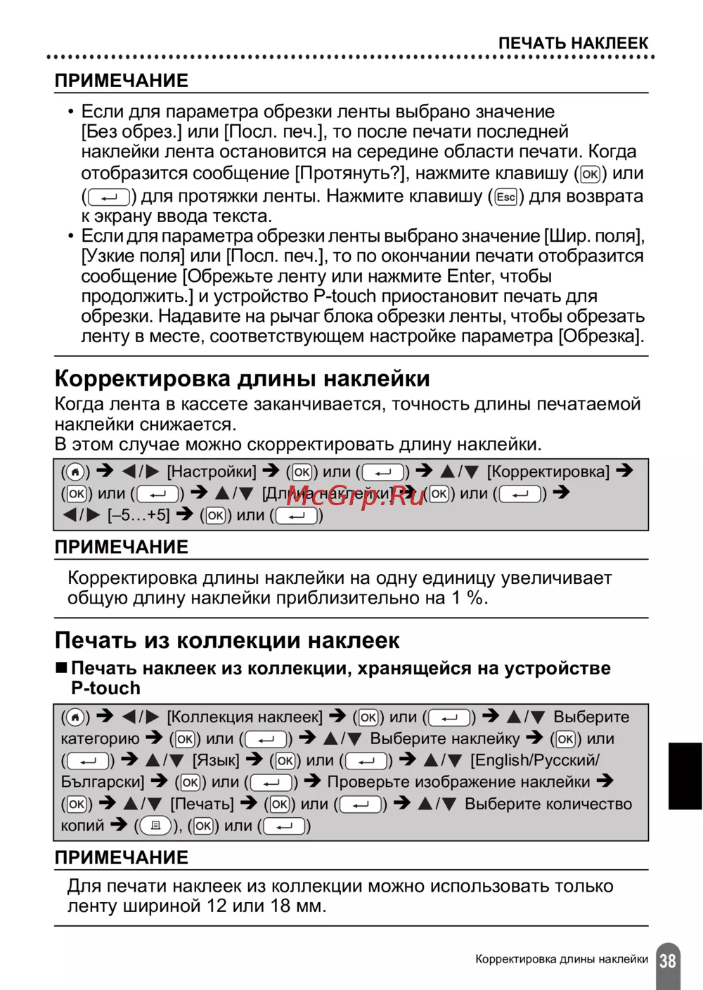 - Когда лента в кассете заканчивается точность длины печатаемой наклейки снижается в этом случае можно скорректировать длину наклейки p.41