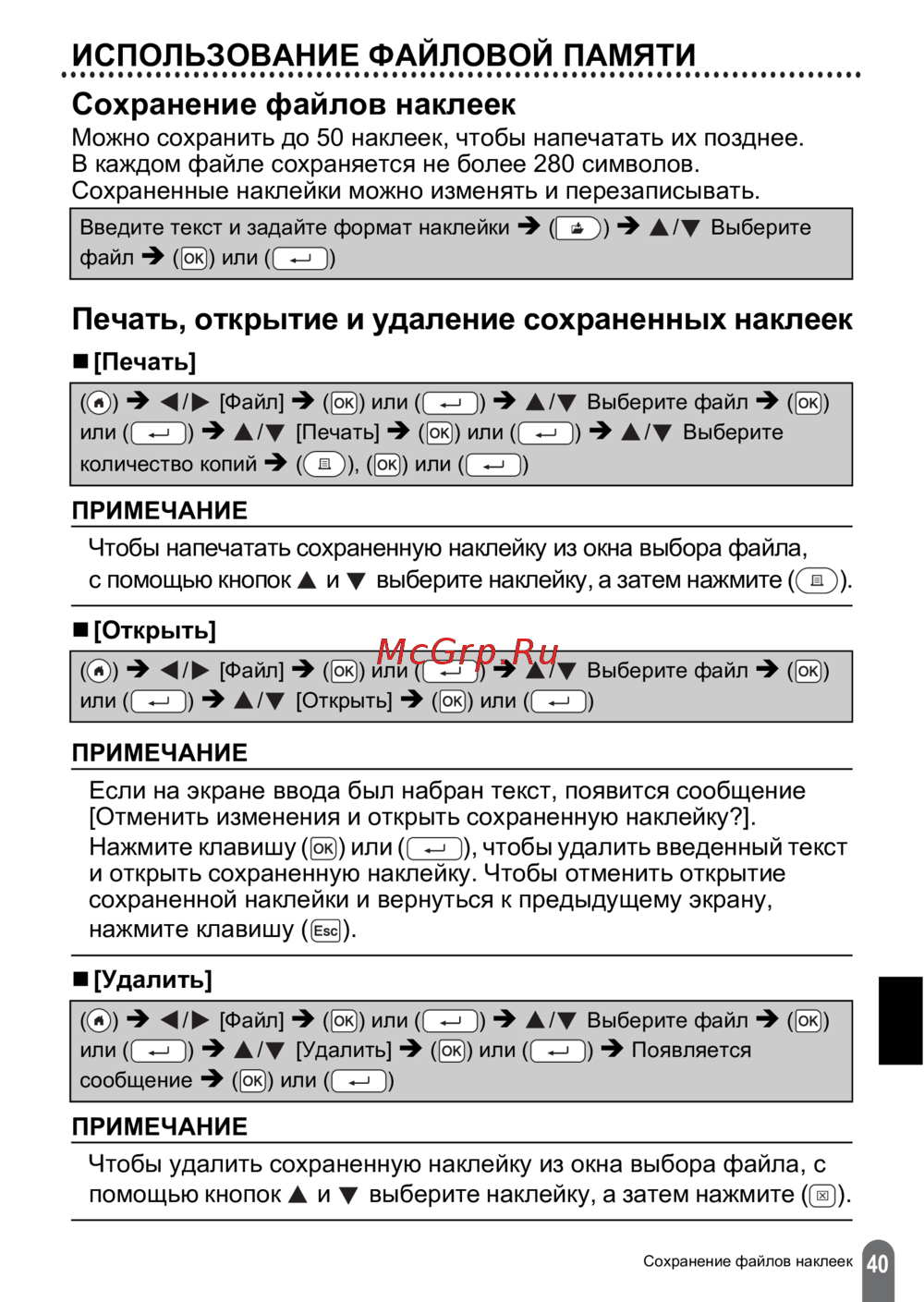 - Можно сохранить до 50 наклеек чтобы напечатать их позднее в каждом файле сохраняется не более 280 символов сохраненные наклейки можно изменять и перезаписывать p.43