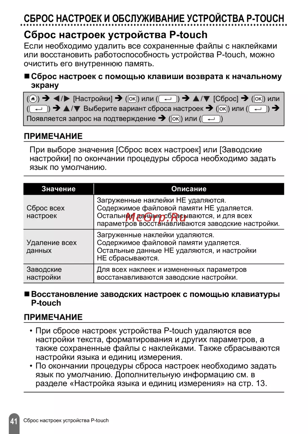 СБРОС НАСТРОЕК И ОБСЛУЖИВАНИЕ УСТРОЙСТВА P-TOUCH