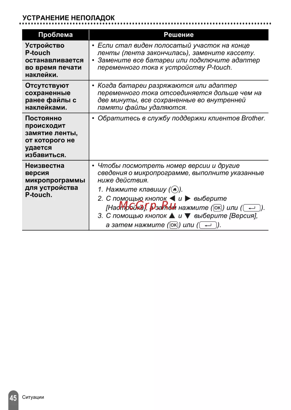 - Сброс настроек и обслуживание устройства p touch 1 p.5