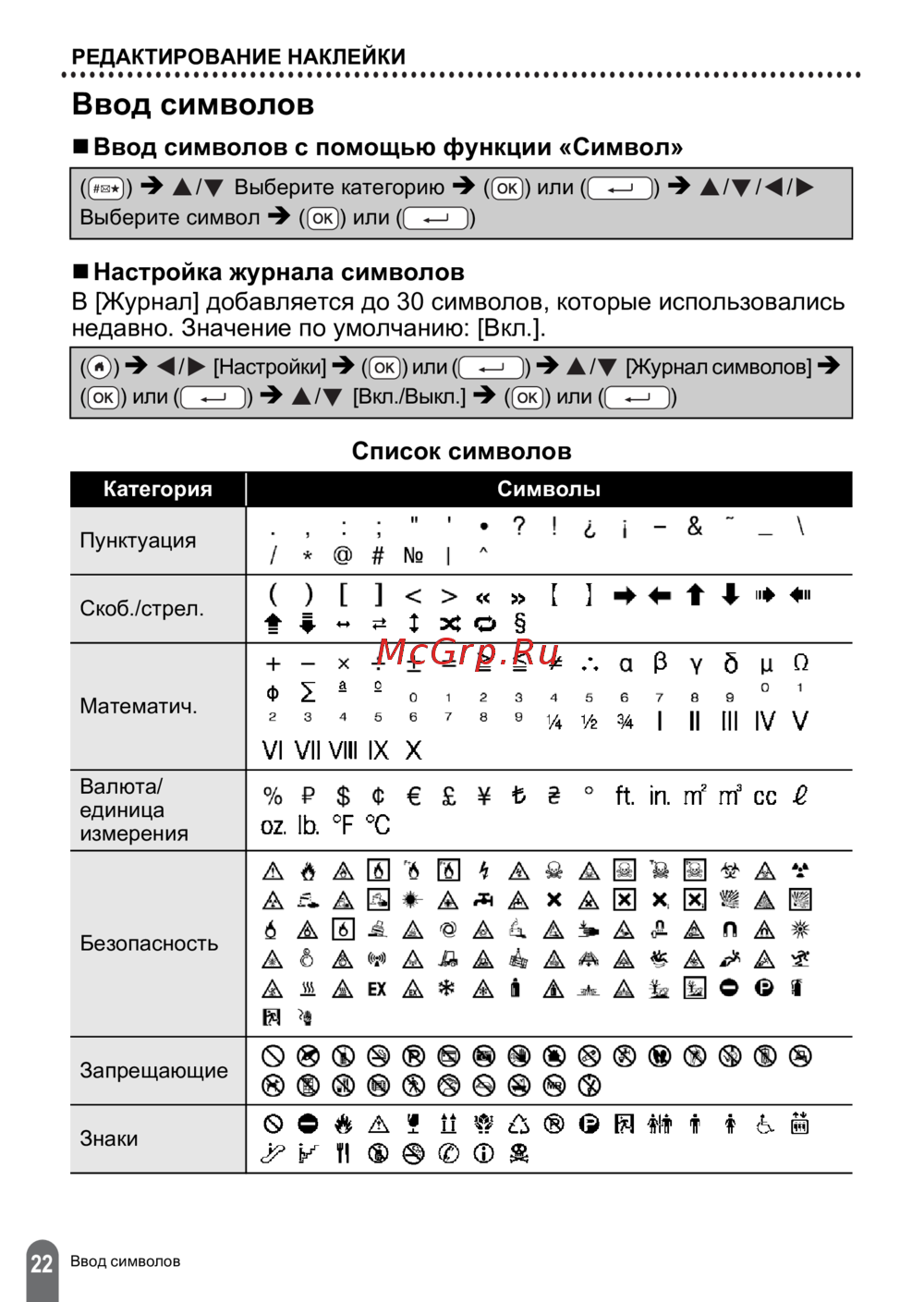 ![Brother PT-D600 [24/59] Список символов](/views2/1470152/page24/bg18.png)