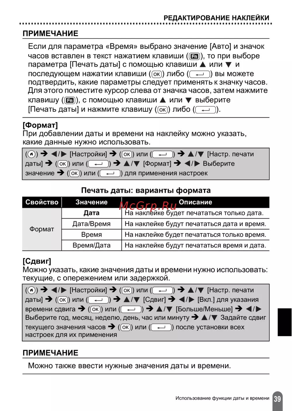 - Формат при добавлении даты и времени на наклейку можно указать какие данные нужно использовать p.41