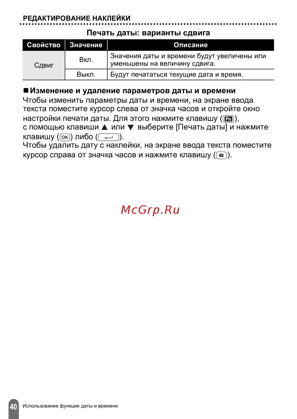 - Настройка печати даты время можно задать печать текущих или предустановленных значений даты и времени p.40