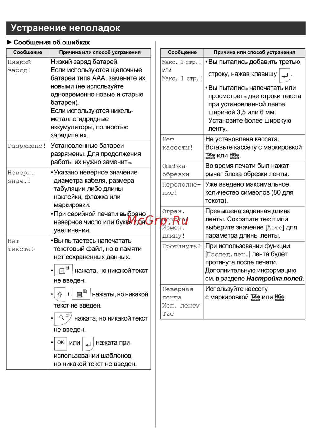 Brother PT-E110 — устранение неполадок и сообщения об ошибках при печати [16/17]
