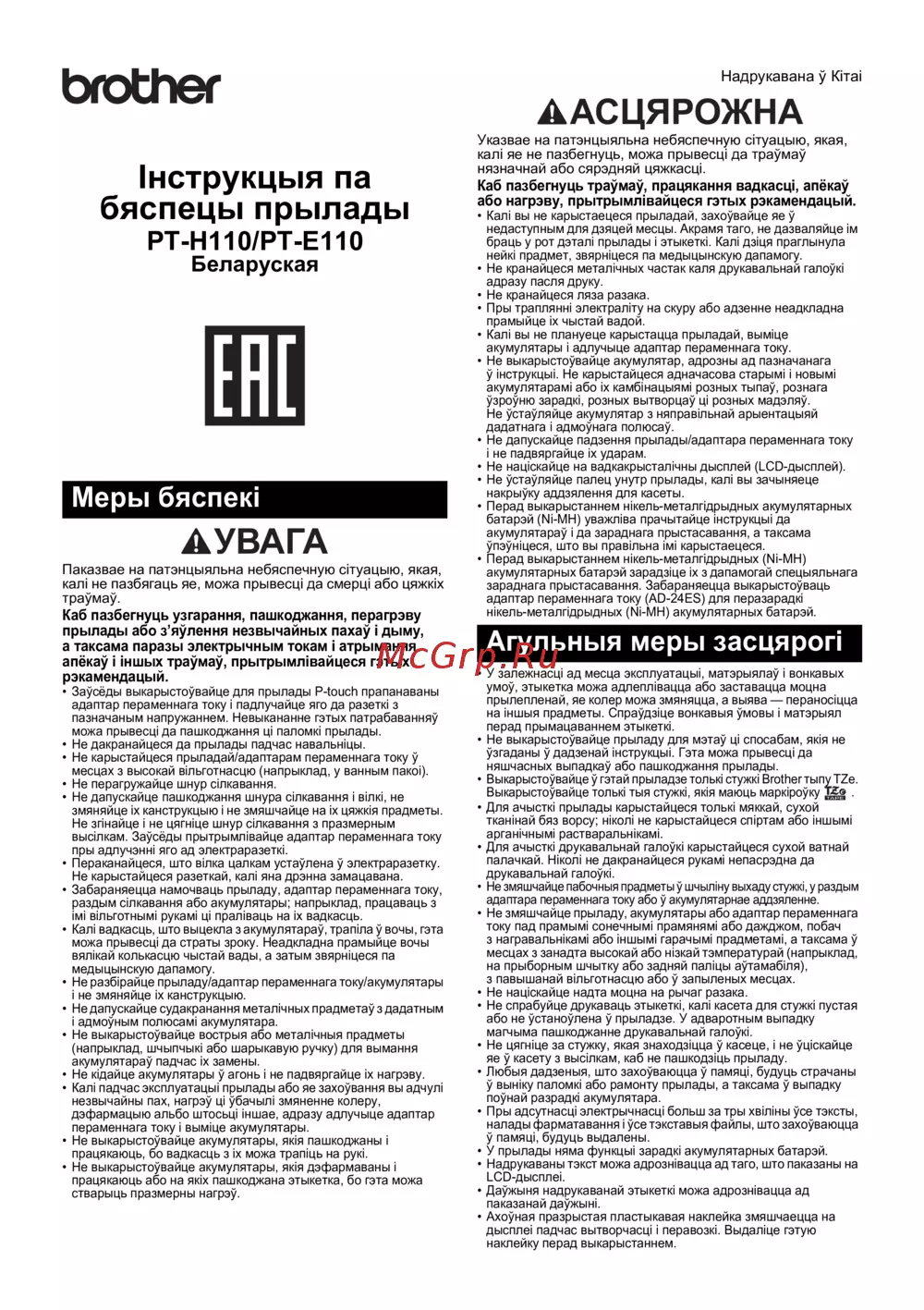 ![Brother PT-E110 [4/4] Указвае на патэнцыяльна небяспечную сітуацыю якая калі яе не пазбегнуць можа прывесці да траўмаў нязначнай або сярэдняй цяжкасці](/views2/1470157/page4/bg4.png)