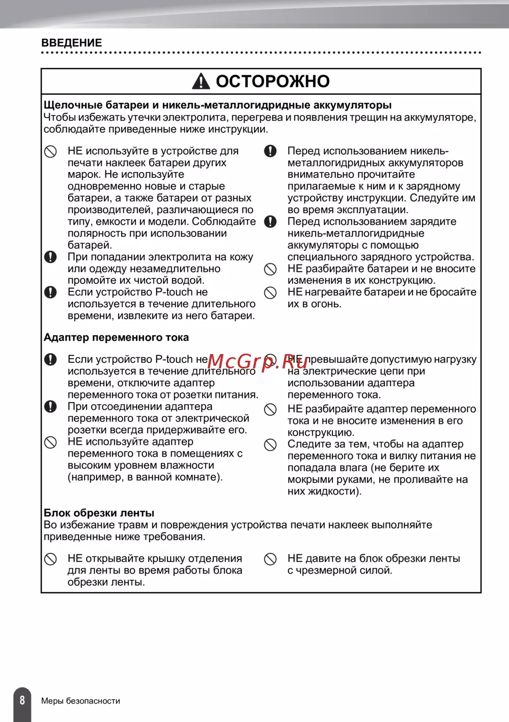 Brother PT-E300 — меры безопасности при использовании батарей и адаптеров [10/62]