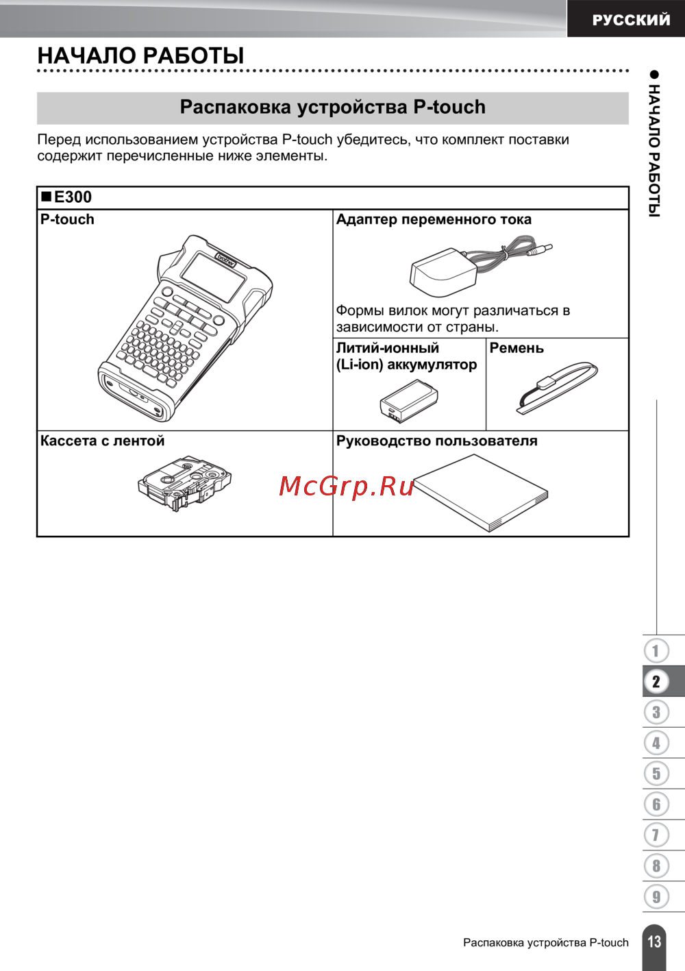 Перед использованием устройства P-touch убедитесь, что комплект поставки