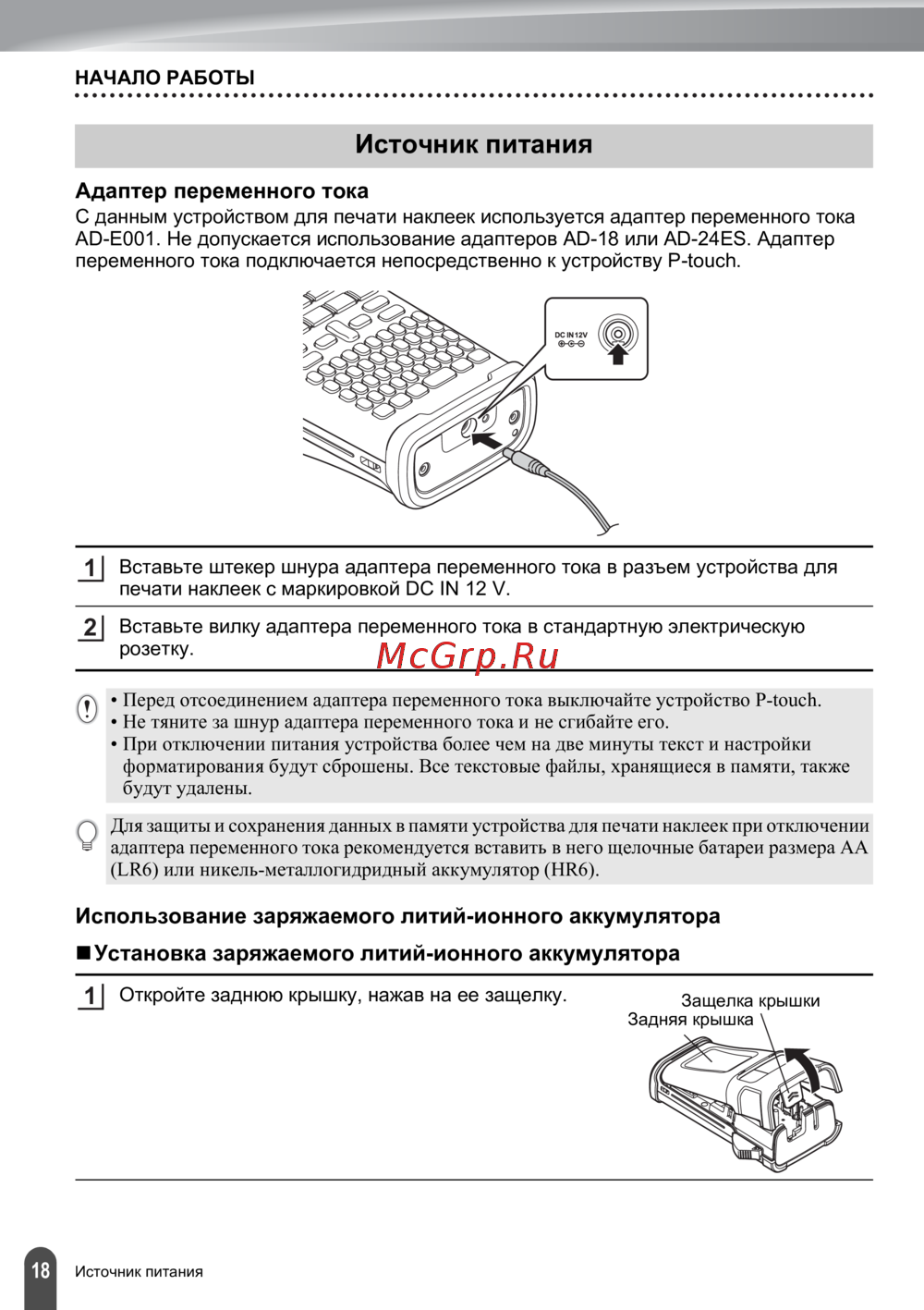 - Использование заряжаемого литий ионного аккумулятора p.20