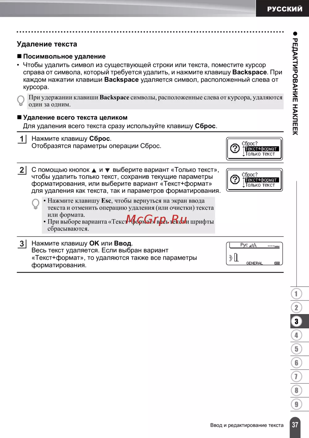 Для удаления всего текста сразу используйте клавишу Сброс.