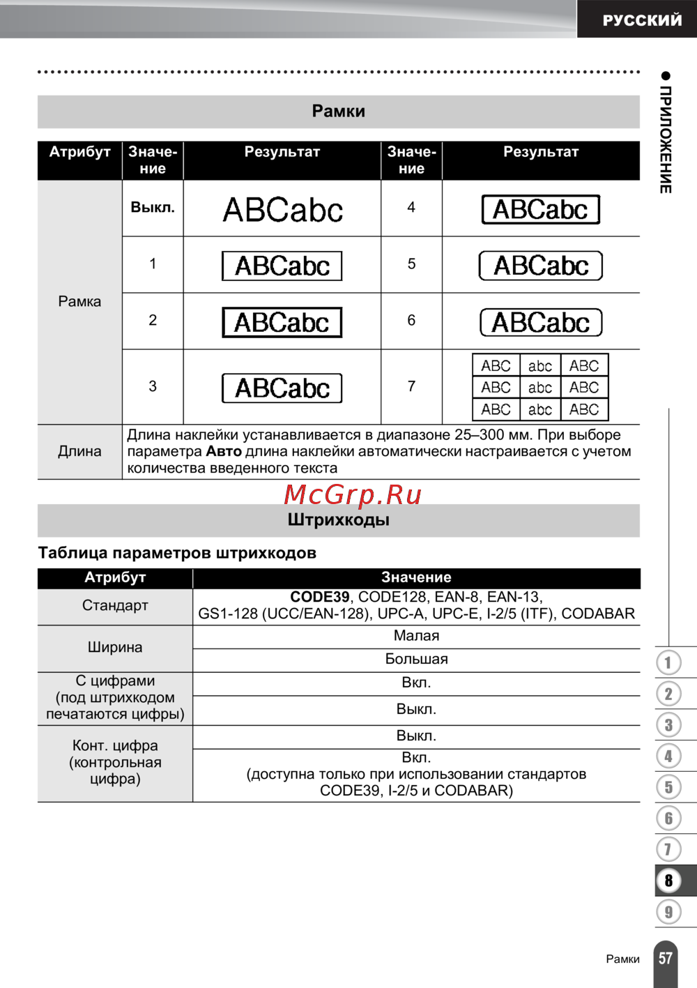 - Таблица параметров штрихкодов p.59