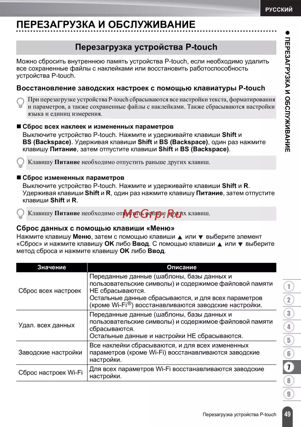 - Восстановление заводских настроек с помощью клавиатуры p touch p.50