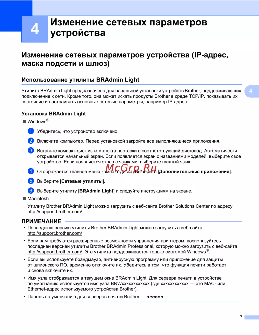 • Последнюю версию утилиты Brother BRAdmin Light можно загрузить с веб-сайта