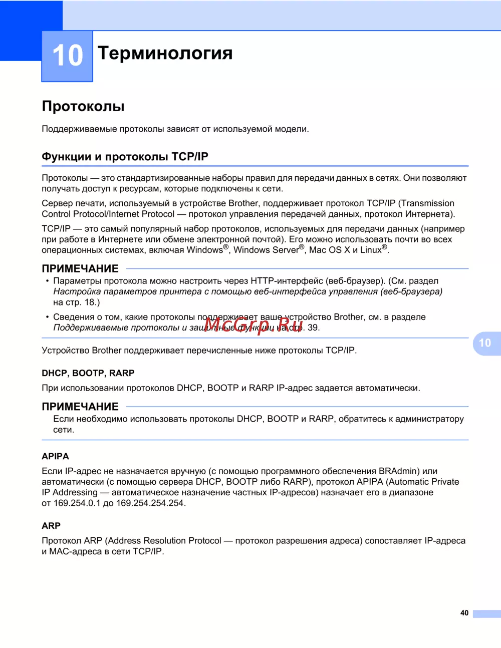 Устройство Brother поддерживает перечисленные ниже протоколы TCP/IP.
