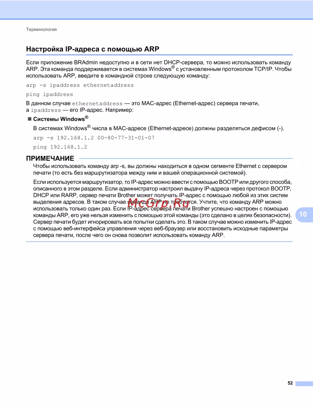DHCP или RARP, сервер печати Brother может получать IP-