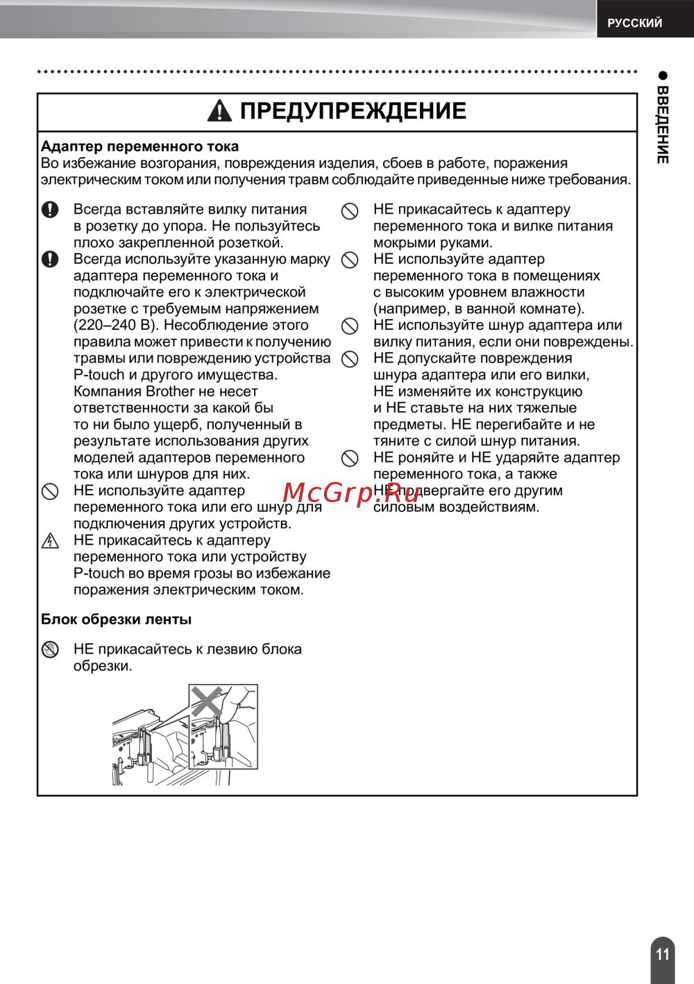 Brother PT-E550W — правила безопасного использования адаптера переменного тока [11/48]