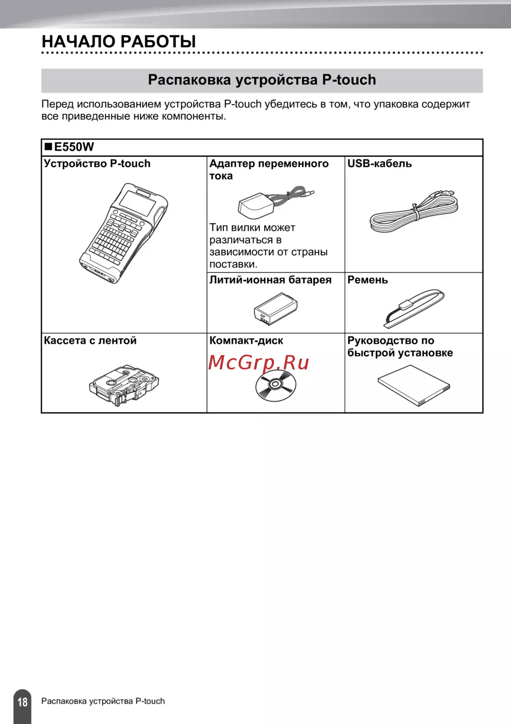 Перед использованием устройства P-touch убедитесь в том, что упаковка содержит