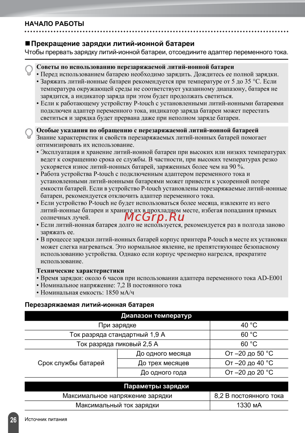 Brother PT-E550W — рекомендации по зарядке и использованию литий-ионных батарей [26/48]