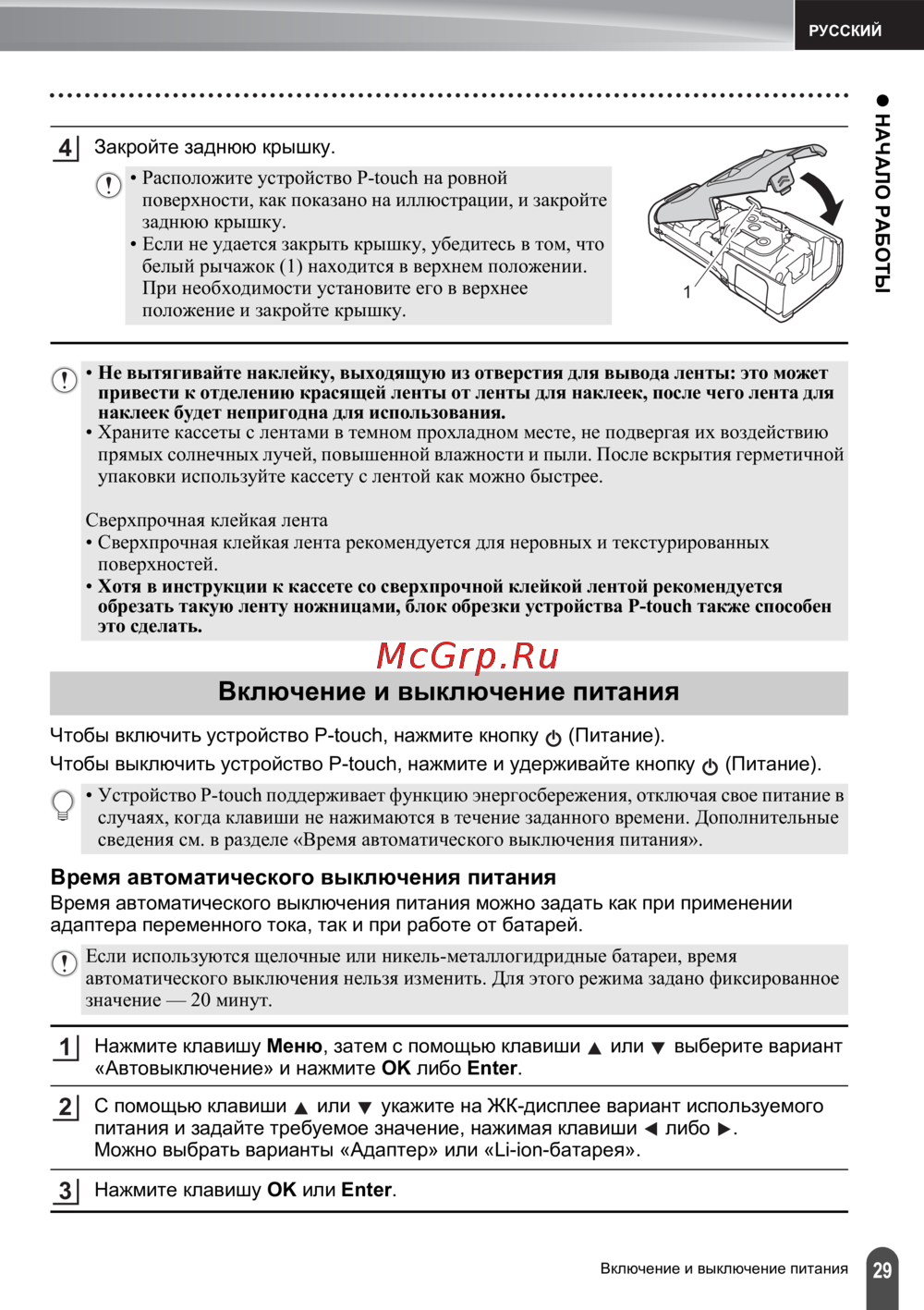 • Устройство P-touch поддерживает функцию энергосбережения, отключая свое питание в
