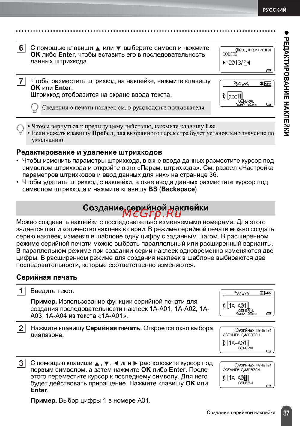 - Настройка параметров штрихкодов и ввод данных для них p.36