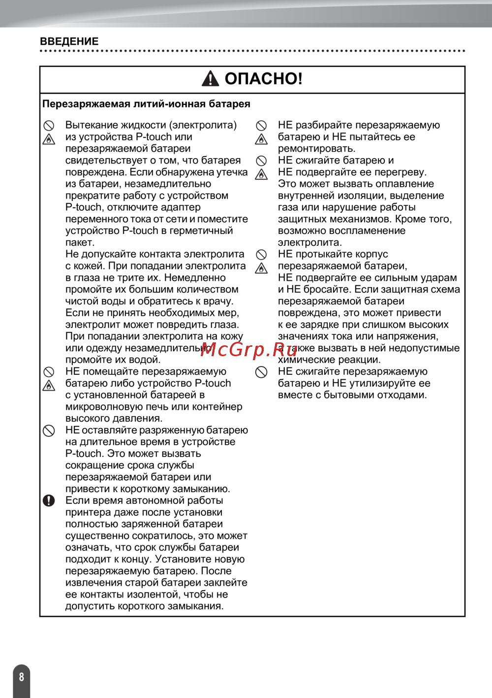 Brother PT-E550W — правила безопасного обращения с перезаряжаемыми батареями [8/48]