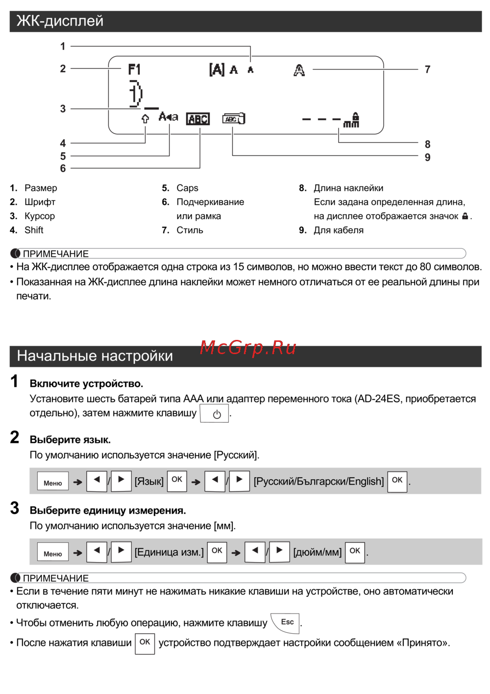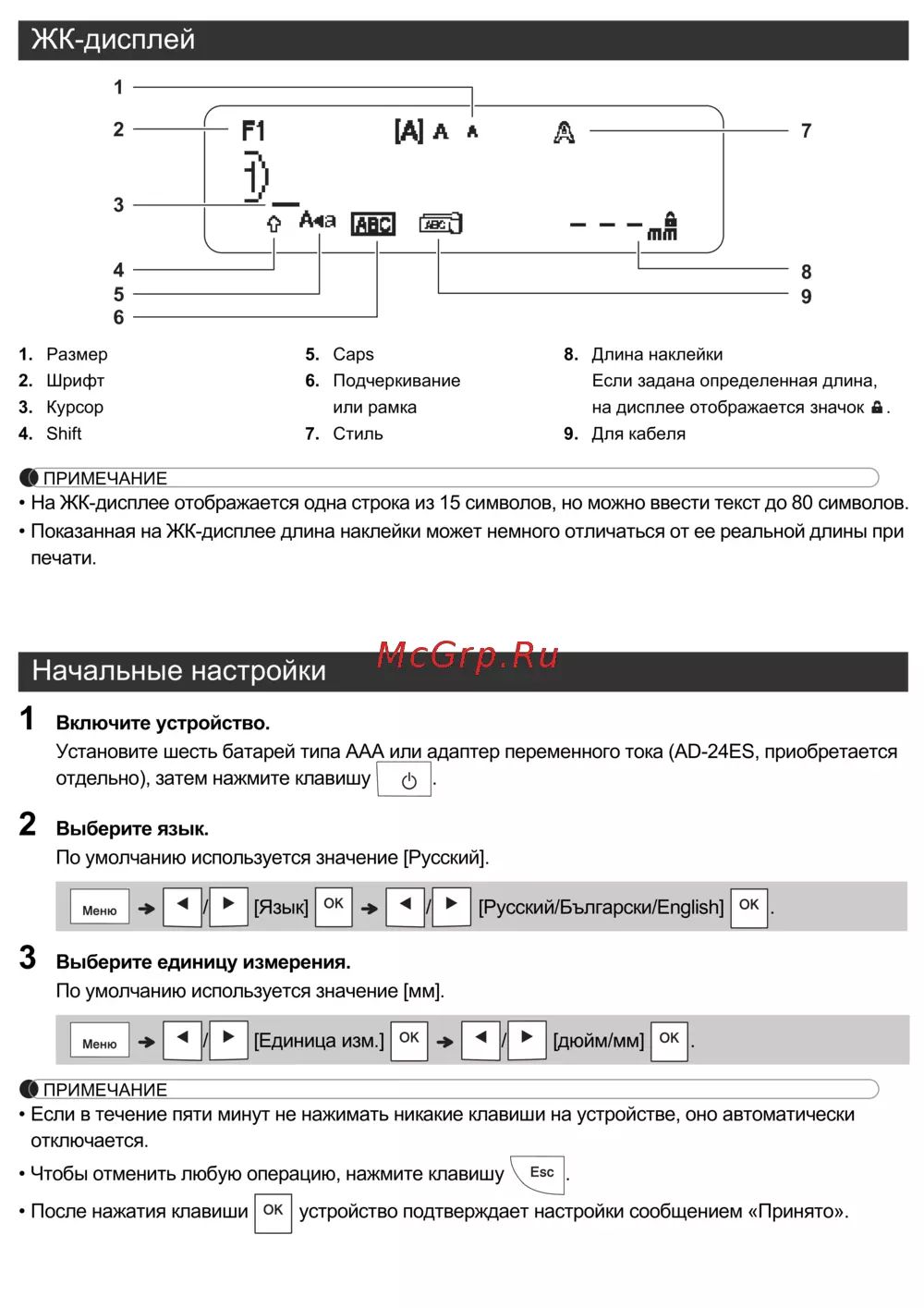 • На ЖК-дисплее отображается одна строка из 15 символов, но можно ввести текст до 80 символов.