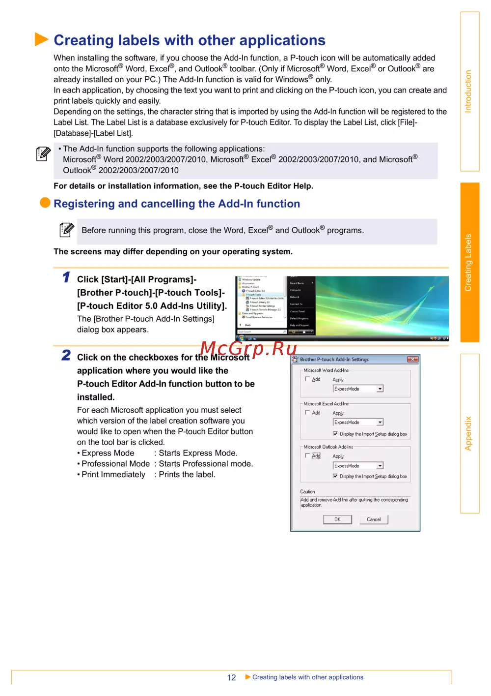 When installing the software, if you choose the Add-In function, a P-touch icon will be automatically added