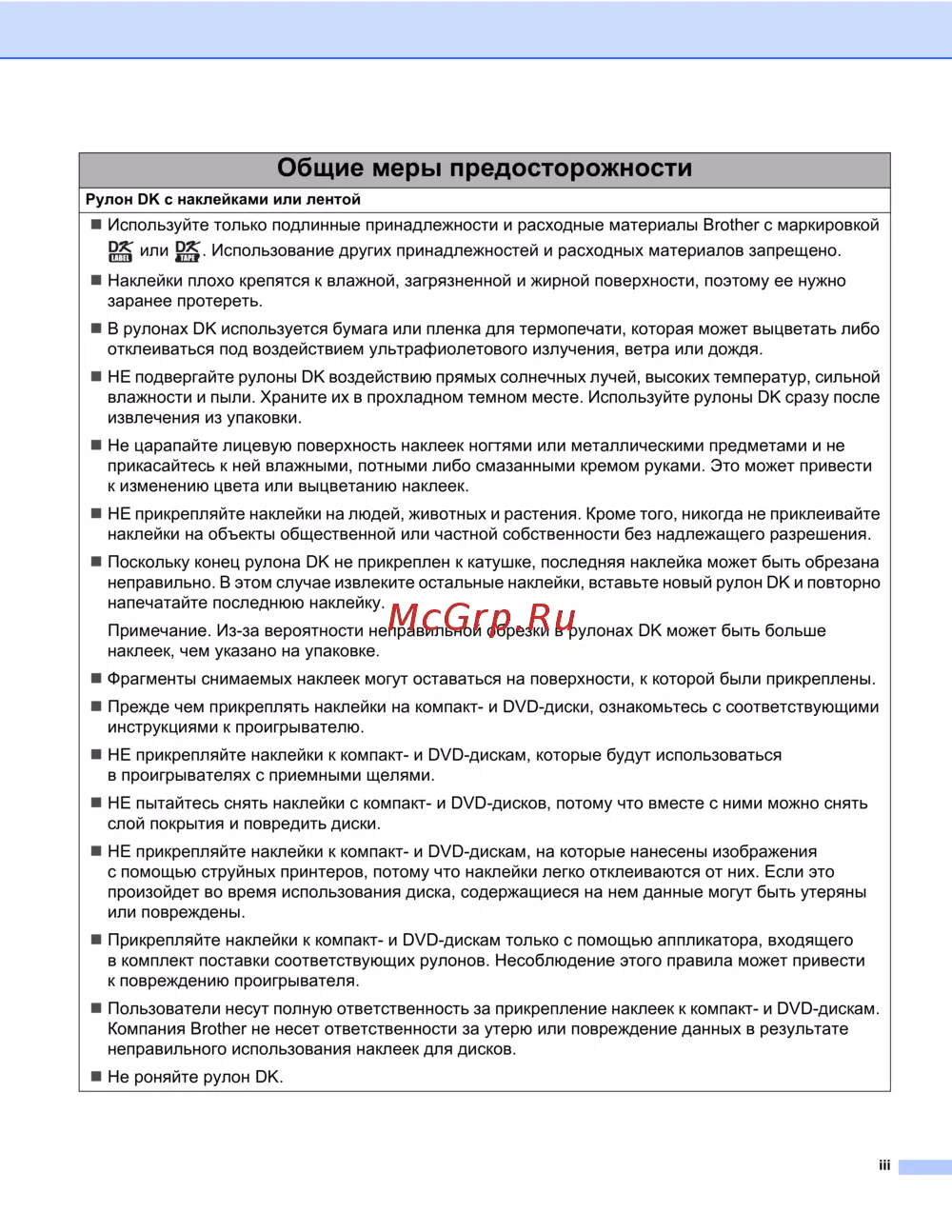 Brother QL-800 — общие меры предосторожности при использовании рулонов с наклейками [4/80]