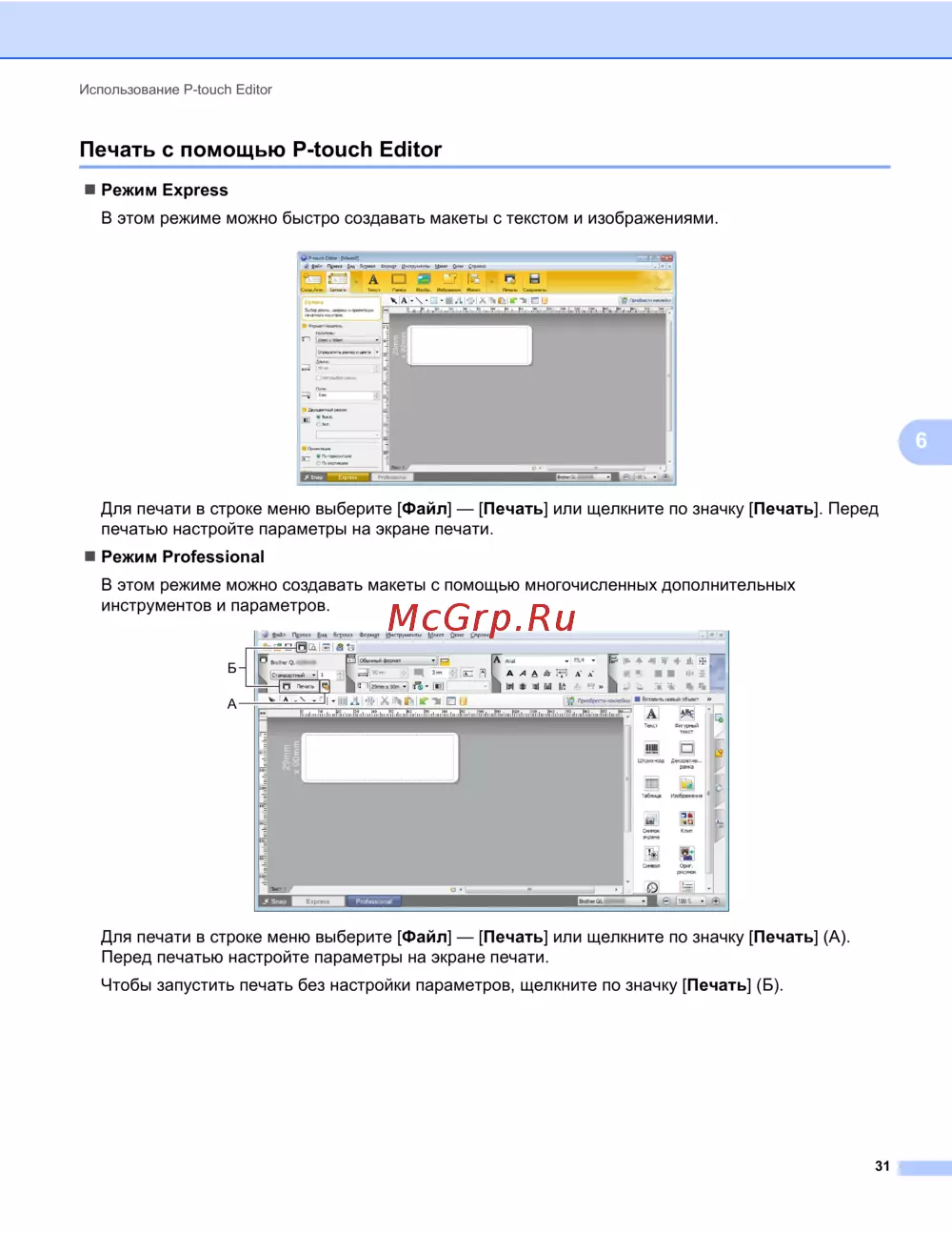 Печать с помощью P-touch Editor 6