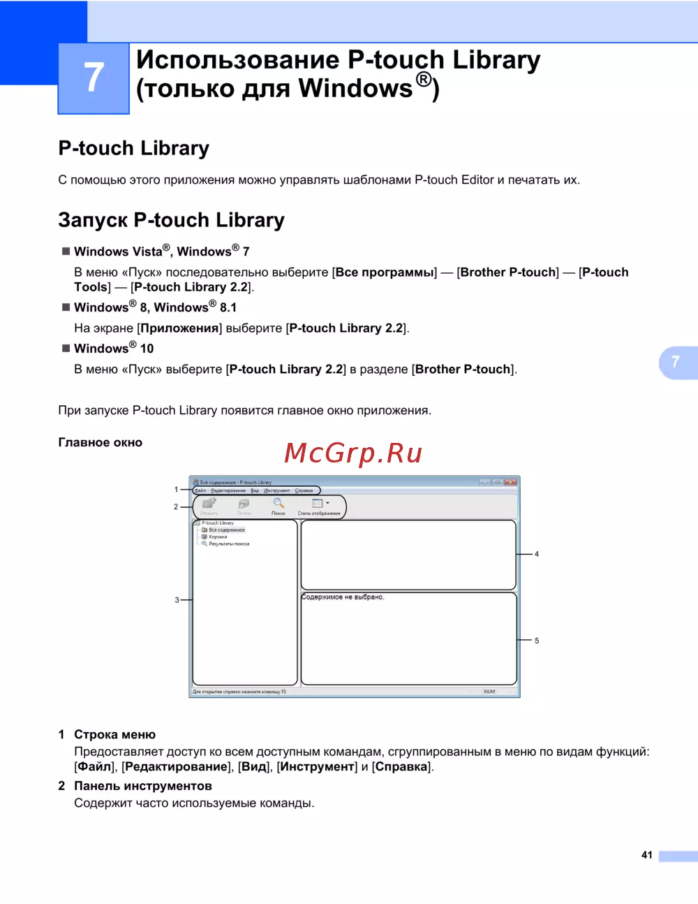 Узнайте, как управлять шаблонами и печатать их с помощью приложения P-touch Library. Подробные инструкции для различных версий Windows.