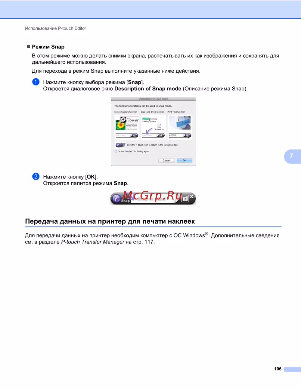Узнайте, как использовать режим Snap в P-touch Editor для создания и печати изображений. Пошаговая инструкция по передаче данных на принтер.