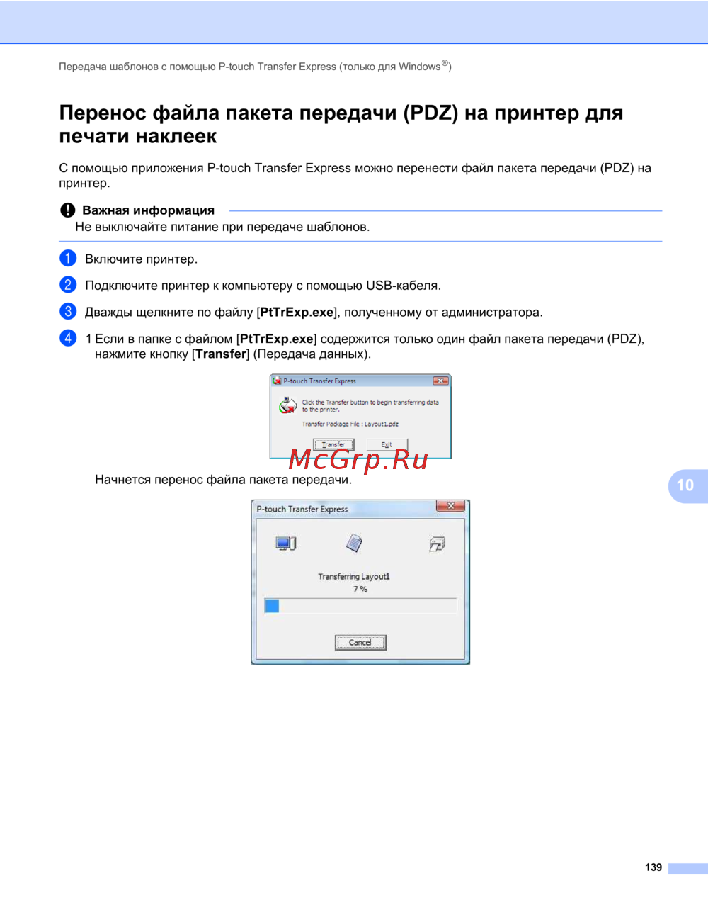 Передача шаблонов с помощью P-touch Transfer Express (только для Windows
