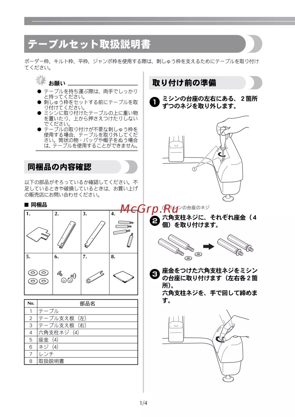 ボーダー枠、キルト枠、平枠、ジャンボ枠を使用する際は、刺しゅう枠を支えるためにテーブルを取り付け