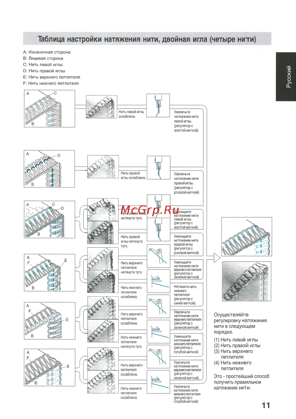 Таблица настройки натяжения нити двойная игла четыре нити А Изнаночная сторона В Лицевая сторона Русский С Нить левой иглы О Нить правой иглы Е Нить верхнего петлителя Е Нить нижнего петлителя Нить левой иглы ослаблена Увеличьте натяжение нити левой иглы регулятор с желтой меткой Нить правой Увеличьте иглы ослаблена натяжение нити правой иглы регулятор с розовой меткой А Ши Нить левой иглы натянута туго Нить правой иглы натянута туго Уменьшите натяжение нити левой иглы регулятор с желтой меткой Уменьшите натяжение нити правой иглы регулятор с розовой меткой Нить верхнего петлителя натянута туго Нить нижнего петлителя ослаблена Уменьшите натяжение нити верхнего петлителя регулятор с зеленой меткой НАтяните нить нижнего петлителя регулятор с синей меткой А Е О1 л Нить верхнего Е петлителя ослаблена Увеличьте натяжение нити верхнего петлителя регулятор с зеленой меткой в Нить нижнего петлителя натянута туго Уменьшите натяжение нити нижнего петлителя регулятор с голубой меткой Нить верхнего петлителя ослаблена Нить нижнего петлителя ослаблена Увеличьте натяжение нити верхнего петлителя регулятор с зеленой меткой Увеличьте натяжение нити нижнего петлителя регулятор с голубой меткой Осуществляйте регулировку натяжения нити в следующем порядке 1 Нить левой иглы 2 Нить правой иглы 3 Нить верхнего петлителя 4 Нить нижнего петлителя Это простейший способ получить правильное натяжение нити 11