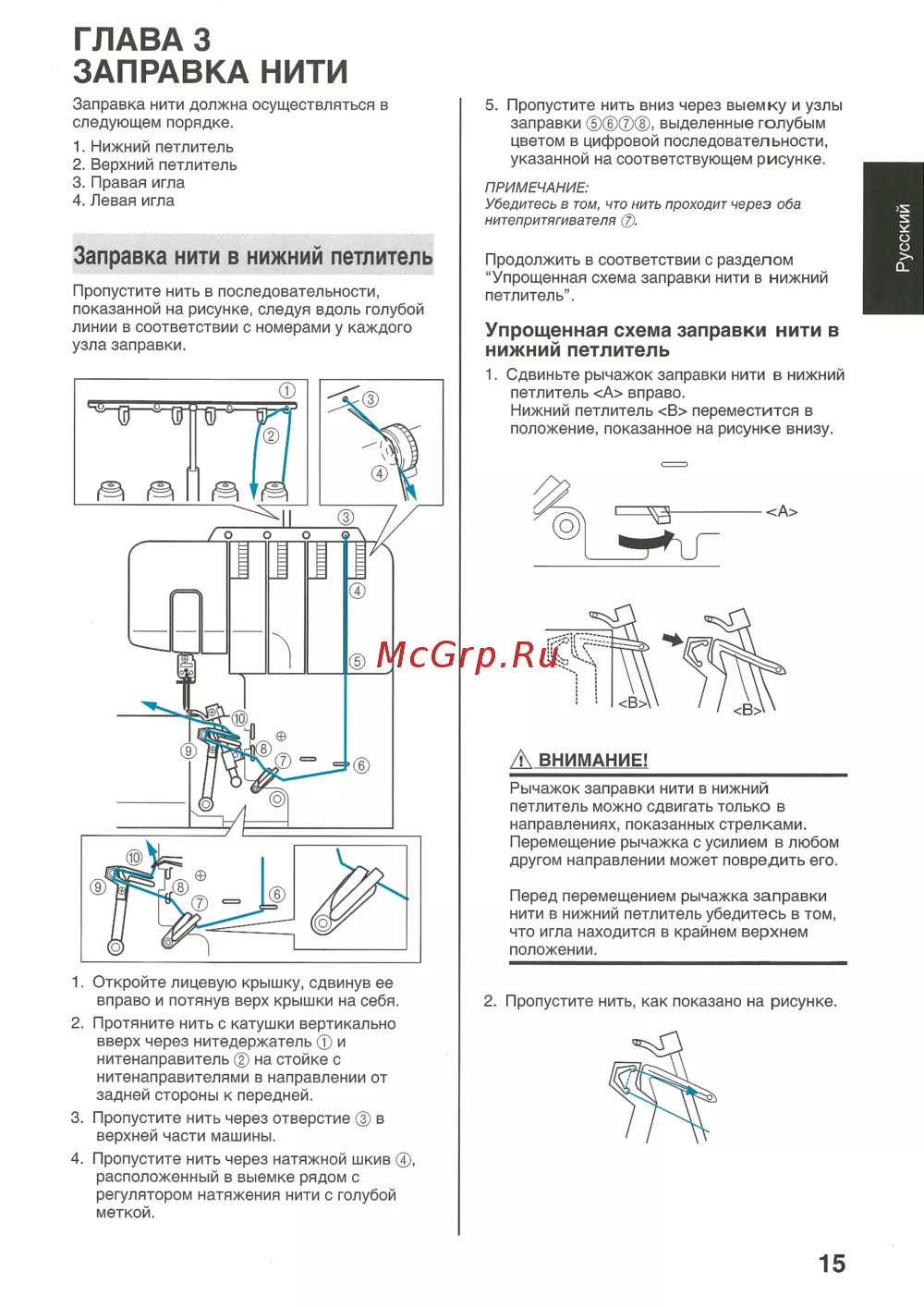 ГЛАВА 3 ЗАПРАВКА НИТИ 1 Нижний петлитель 2 Верхний петлитель 3 Правая игла 4 Левая игла Заправка нити в нижний петлитель Пропустите нить в последовательности показанной на рисунке следуя вдоль голубой линии в соответствии с номерами у каждого узла заправки 5 Пропустите нить вниз через выемку и узлы заправки выделенные голубым цветом в цифровой последовательности указанной на соответствующем рисунке ПРИМЕЧАНИЕ Убедитесь в том что нить проходит через оба нитепритягивателя 7 Русский Заправка нити должна осуществляться в следующем порядке Продолжить в соответствии с разделом Упрощенная схема заправки нити в нижний петлитель Упрощенная схема заправки нити в нижний петлитель 1 Сдвиньте рычажок заправки нити в нижний петлитель А вправо Нижний петлитель В переместится в положение показанное на рисунке внизу Л ВНИМАНИЕ ____________________ Рычажок заправки нити в нижний петлитель можно сдвигать только в направлениях показанных стрелками Перемещение рычажка с усилием в любом другом направлении может повредить его Перед перемещением рычажка заправки нити в нижний петлитель убедитесь в том что игла находится в крайнем верхнем положении 1 Откройте лицевую крышку сдвинув ее вправо и потянув верх крышки на себя 2 Пропустите нить как показано на рисунке 2 Протяните нить с катушки вертикально вверх через нитедержатель ф и нитенаправитель на стойке с нитенаправителями в направлении от задней стороны к передней 3 Пропустите нить через отверстие в верхней части машины 4 Пропустите нить через натяжной шкив расположенный в выемке рядом с регулятором натяжения нити с голубой меткой 15