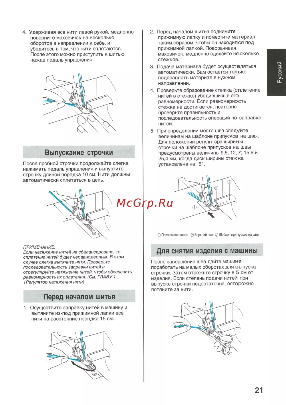 2 Перед началом шитья поднимите прижимную лапку и поместите материал таким образом чтобы он находился под прижимной лапкой Поворачивая маховичок медленно сделайте несколько стежков Русский 4 Удерживая все нити левой рукой медленно поверните маховичок на несколько оборотов в направлении к себе и убедитесь в том что нити сплетаются После этого можно приступить к шитью нажав педаль управления 3 Подача материала будет осуществляться автоматически Вам остается только подправлять материал в нужном направлении 4 Проверьте образование стежка сплетение нитей в стежке убедившись в его равномерности Если равномерность стежка не достигается повторно проверьте правильность и последовательность операций по заправке нитей Выпускание строчки После пробной строчки продолжайте слегка нажимать педаль управления и выпустите строчку длиной порядка 10 см Нити должны автоматически сплетаться в цепь 5 При определении места шва следуйте величинам на шаблоне припусков на швы Для положения регулятора ширины строчки на шаблоне припусков на швы предусмотрены величины 9 5 12 7 15 9 и 25 4 мм когда диск ширины стежка установлена на 5 Прижимная лапка Верхний нож Шаблон припусков на швы ПРИМЕЧАНИЕ Если натяжение нитей не сбалансировано то сплетение нитей будет неравномерным В этом случае слегка вытяните нити Проверьте последовательность заправки нитей и отрегулируйте натяжение нитей чтобы обеспечить равномерность их сплетения См ГЛАВУ 1 1 Регулятор натяжения нити Для снятия изделия с машины После завершения шва дайте машине поработать на малых оборотах для выпуска строчки Затем отрежьте строчку в 5 см от изделия Если степень подачи нитей при выпуске строчки недостаточна осторожно потяните за нити Перед началом шитья 1 Осуществите заправку нитей в машину и вытяните из под прижимной лапки все нити на расстояние порядка 15 см 21
