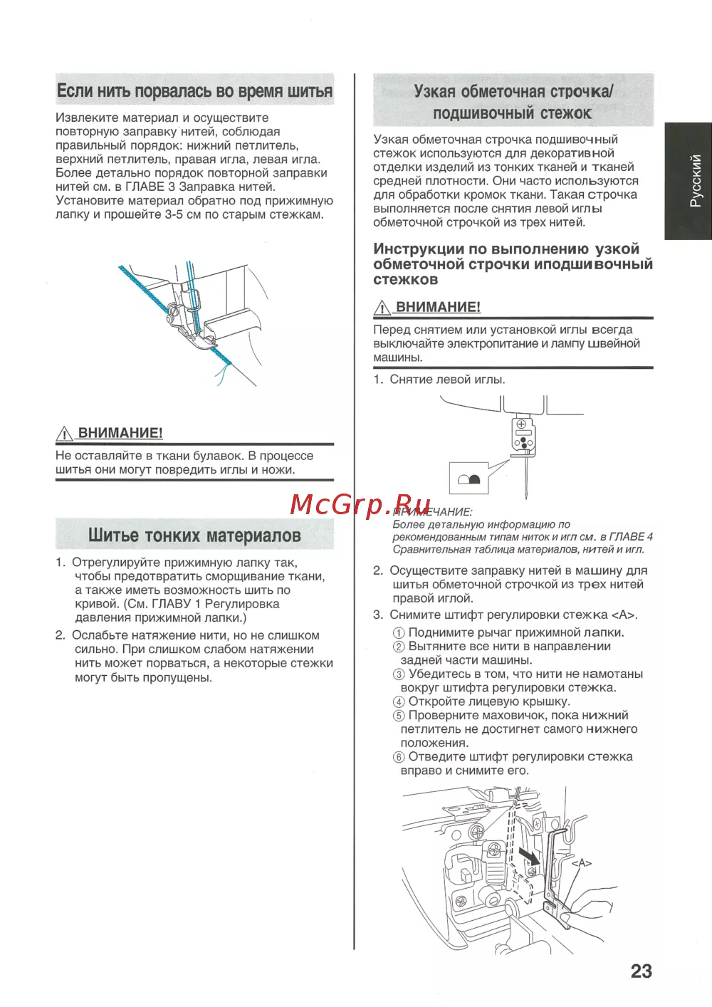 Извлеките материал и осуществите повторную заправку нитей соблюдая правильный порядок нижний петлитель верхний петлитель правая игла левая игла Более детально порядок повторной заправки нитей см в ГЛАВЕ 3 Заправка нитей Установите материал обратно под прижимную лапку и прошейте 3 5 см по старым стежкам Узкая обметочная строчка подшивочный стежок Узкая обметочная строчка подшивочный стежок используются для декоративной отделки изделий из тонких тканей и тканей средней плотности Они часто используются для обработки кромок ткани Такая строчка выполняется после снятия левой иглы обметочной строчкой из трех нитей Русский Если нить порвалась во время шитья Инструкции по выполнению узкой обметочной строчки иподшивочный стежков Д ВНИМАНИЕ _______________________ Перед снятием или установкой иглы всегда выключайте электропитание и лампу швейной машины 1 Снятие левой иглы Д ВНИМАНИЕ _____________________ Не оставляйте в ткани булавок В процессе шитья они могут повредить иглы и ножи Шитье тонких материалов 1 Отрегулируйте прижимную лапку так чтобы предотвратить сморщивание ткани а также иметь возможность шить по кривой См ГЛАВУ 1 Регулировка давления прижимной лапки 2 Ослабьте натяжение нити но не слишком сильно При слишком слабом натяжении нить может порваться а некоторые стежки могут быть пропущены ПРИМЕЧАНИЕ Более детальную информацию по рекомендованным типам ниток и игл см в ГЛАВЕ 4 Сравнительная таблица материалов нитей и игл 2 Осуществите заправку нитей в машину для шитья обметочной строчкой из трех нитей правой иглой 3 Снимите штифт регулировки стежка А Поднимите рычаг прижимной лапки Вытяните все нити в направлении задней части машины Убедитесь в том что нити не намотаны вокруг штифта регулировки стежка Откройте лицевую крышку Проверните маховичок пока нижний петлитель не достигнет самого нижнего положения Отведите штифт регулировки стежка вправо и снимите его 23