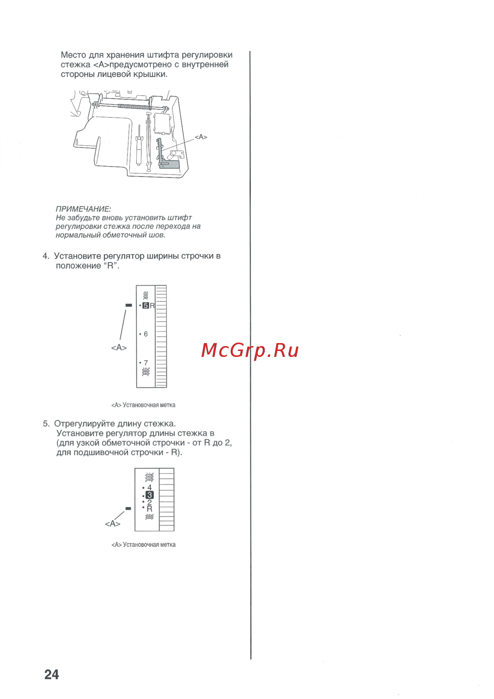 Место для хранения штифта регулировки стежка А предусмотрено с внутренней стороны лицевой крышки ПРИМЕЧАНИЕ Не забудьте вновь установить штифт регулировки стежка после перехода на нормальный обметочный шов 4 Установите регулятор ширины строчки в положение R А Установочная метка 5 Отрегулируйте длину стежка Установите регулятор длины стежка в для узкой обметочной строчки от R до 2 для подшивочной строчки R А Установочная метка 24
